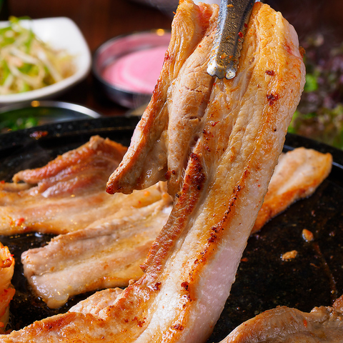 国内産の上質な生三段バラを使用したサムギョプサルは、柔らかい肉質と臭みのない味わいで、パクパク食べられます。スタッフが焼き加減を調整します。ごま油や辛味噌を添えてサンチュで巻いてお楽しみください。エゴマの葉や日替わりのおかずとも相性抜群で、鉄板で焼いたキムチとの組み合わせも絶品です。