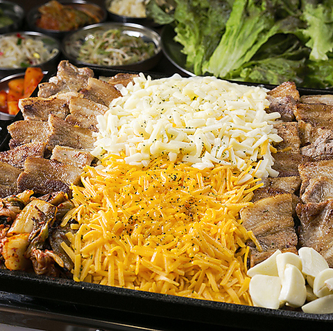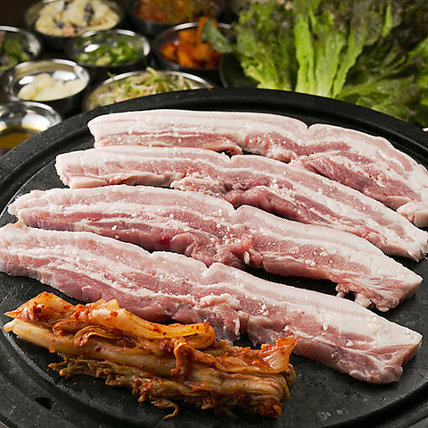 サムギョプサル(豚バラ肉)は、アバラ骨の周りの肉で、赤身と脂肪が交互に三層になっているため「三枚肉」とも呼ばれます。全体的に柔らかく、脂肪分が豊富でコクと旨味が特徴です。当店とんちゃんでは、100%国産豚肉を使用し、特に柔らかくて美味しい部分を提供しています。以前よりも厚くカットされた厳選肉をぜひご賞味ください!