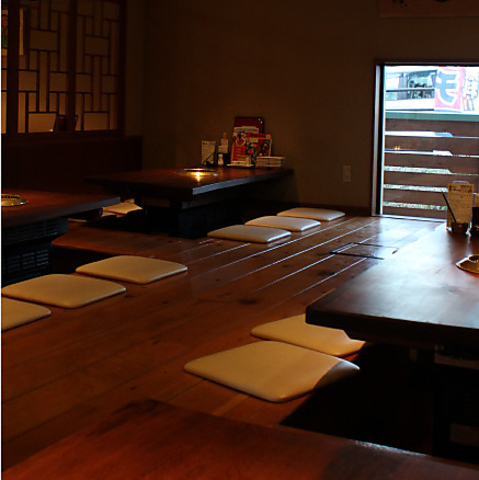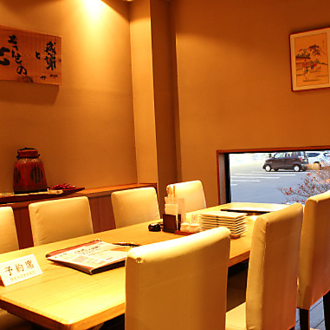 北側のガラス窓からは、自然光がたっぷりと差し込み、明るい雰囲気に包まれます。夜になると、外から見える内装は、輝きを放ちます。また、他の店舗同様、所々に長野県産の木材を使用しております。ベルプラザSC内に位置しているため、広々とした駐車場も完備。座席数は106席をご用意しており、座席、座敷、個室の3種類からお選びいただけます。