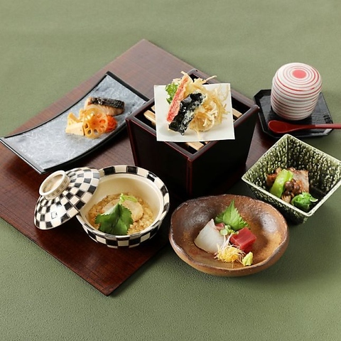 東備地区の食材を中心に岡山県産の季節の海産物や野菜を幅広く楽しめる会席です。鰆、黄ニラ、日生の海鼠、岡山のフルーツなど。