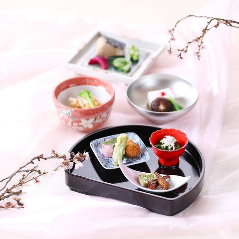 岡山産備前黒牛の炙り焼き、鰆の焼物、サヨリのお造り、蛍烏賊、黄ニラ、子持ち白魚などのほか、山菜や海産物などの季節の味覚と郷土の味覚を堪能できる会席料理。