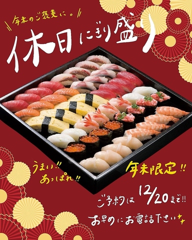 年末年始テイクアウト予約受付中!豪華寿司盛り合わせ&特製御膳で華やかなお正月を!今年も数量限定でのご提供となりますので、「お正月 海鮮オードブル」「おせち代わりのご馳走」をお探しの方は、お早めにご予約ください!【ご予約はお電話にて】・大町本店:0120-291-025・秋田駅東口店:080-2846-9318
