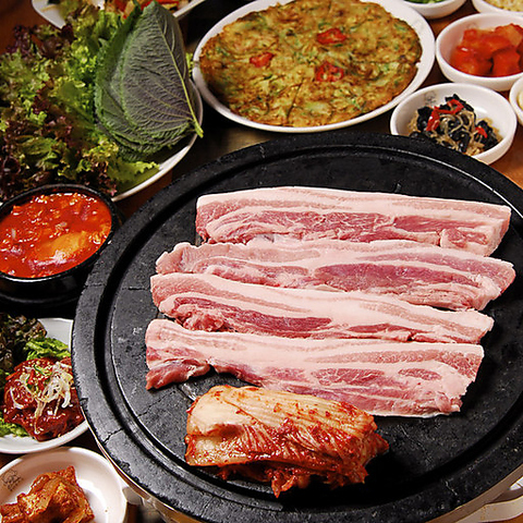 日本産上質三段バラ使用のサムギョプサルは当店の名物料理!脂身がしつこくない、お肉の旨味をしっかりと味わえるのが魅力的◎サンチュに包んで食べれば、ヘルシーにお楽しみいただけます♪