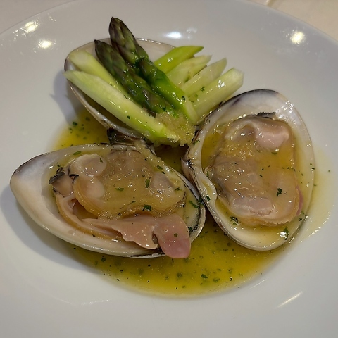 ハマグリとアスパラをシェリービネガーとヴェルモット酒ソースで