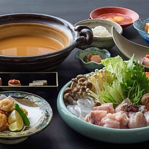 前菜から〆の食事まで、フグの王様“トラフグ”づくしの贅沢コース。〆の食事には、料理長こだわりのふぐ雑炊をお召し上がりください。※香ばしく焼き上げたヒレを入れた「ヒレ酒」1,000円もございます。※3日前20時までの事前ご予約制です。