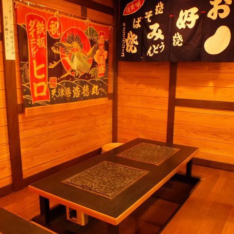 一風変わった正方形のテーブル席♪みんなで鉄板を囲みながらワイワイできるのも鉄板焼きのいいところ◎本場九州蔵元より名品を直送 三岳・愛子・錫釜など呑兵衛も納得の品揃えのお酒と共にお楽しみください!