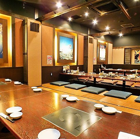 【ゆっくり楽しめるお座敷掘りごたつ席】開放感溢れるお座敷掘りごたつ個室も完備しております。テーブル個室とつなげて最大54名様までご利用可能なので、歓送迎会・同窓会等の各種宴会に是非ご利用ください。54名様以上でのご利用もお気軽にお問い合わせください!