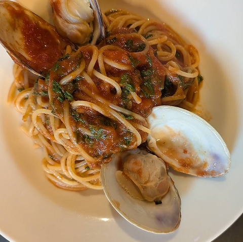 ハマグリ出汁の効いたトマトソースに大葉のアクセントが際立ちます。