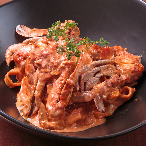 ランチ・ディナーともにご注文いただける【渡りガニのフェットチーネ トマトクリームソース】大人気のお料理です!当店自慢の味をご堪能くださいませ♪