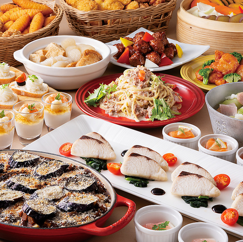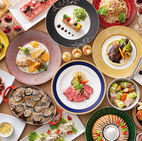 1名様1品限定チョイスの「メイン料理」に、約40種の「食べ放題」メニューのビュッフェ・アルコールフリードリンク(ディナータイム限定)に、乾杯用スパークリングワインが付いております。最大3時間ご利用可能でごゆっくりお過ごしいただけます。
