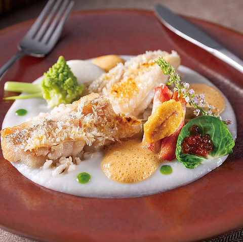 うろこ付きの甘鯛をパリッと焼き、ズワイガニ・イクラ・ウニを添えました。優しい苦みを感じる蕪(カブラ)のピュレと、甲殻類の泡ソースでお召しあがりください。※プラス500円