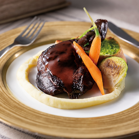「サーロインステーキのグリル 温野菜添え」はジューシーで柔らかく、食べ応え抜群!山葵ワサビ・塩・にんにく醤油をご用意。お好みの味でお愉しみください。※プラス500円