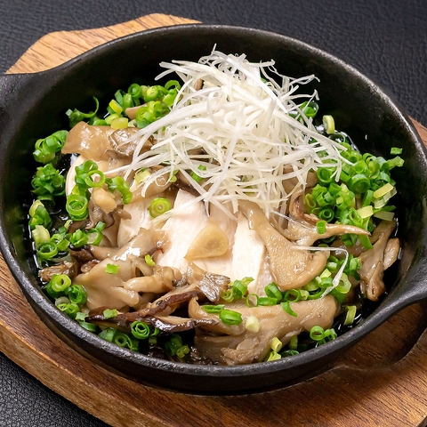低温のオイルでじっくり煮込み柔らかくジューシーに仕上げたむね肉を、たっぷりのキノコと共に鉄板でご提供。