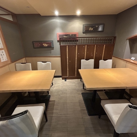 テーブルを結合すれば最大16名様まで対応可能な半個室空間。和の雰囲気が漂う落ち着いた内装で、会社のご宴会や親族での集まり、大切な会合など幅広いシーンに最適です。周囲とは程よく仕切られており、会話も弾むゆったりとしたひとときをお過ごしいただけます。団体利用におすすめです。