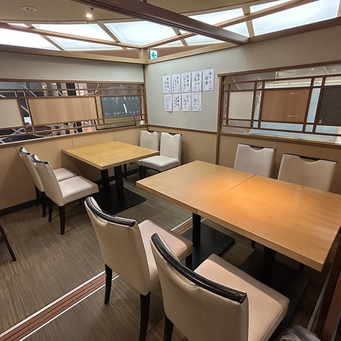開放感のある和モダンな空間に配置された8名様用テーブル席。明るく上品な内装と程よい仕切りで、プライベート感も確保されています。ご家族でのお食事やご友人との集まり、少人数のご宴会やお祝い事など、さまざまなシーンに対応可能。落ち着いた空間でゆったりとお過ごしいただけます。