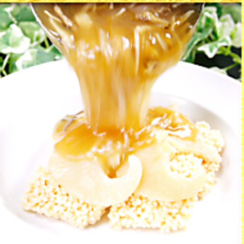 横浜中華街・市場通りで人気のお焦げ料理を豊富に取り揃えている中華料理店です。薄く平らに伸ばしたお米を油で揚げ、その上からアツアツの餡をかけて食べる料理です。五目、海鮮、フカヒレなど様々な種類を1,980円 (税込)~ご用意しております。