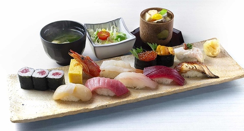 福兆 名戸ケ谷本店の贅沢で美味しい鮨に舌鼓!お得なランチをぜひお試しください。 ※写真は、上ランチにぎり2,750円(税込)■《秋刀魚のポン酢ジュレ》と《ふんわり穴子》の季節旬ねたに、人気の中とろ、うになど盛り沢山!※写真は一例です。日により季節ねたの一部が変わる場合がございます。