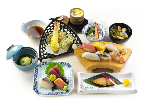 あぶり鮨を含むにぎり5貫に天ぷら、せいろ蕎麦、茶碗蒸しとボリューム満点のお得膳!・サラダ・お椀・天ぷら・茶碗蒸し