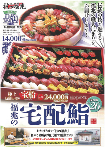 - 技の福兆 名戸ヶ谷店(本店)電話 04-7169-0009●受付時間→ 9:30~14:30・17:00~20:00●宅配時間→ 11:00~15:00・17:00~20:30●ご注文は3,240円(税込)以上にて承ります。●順番に係の者へお知らせください (1)お客様のお電話番号⇒(2)お名前⇒(3)ご住所・お届け先⇒(4)品名と数量⇒(5)器の種類(鮨桶またはご返却不要のプラスチック容器)⇒(6)お届けご希望の日時●わさび抜きや、わさび別添え、ねた(内容)の一部変更などもお気軽にご相談ください。●店舗にて飯台でのお渡し&ご返却特典!→お電話でご注文後、ご来店にて飯台でのお渡し&飯台ご返却の場合ですと【商品代金より5%割引】致します。