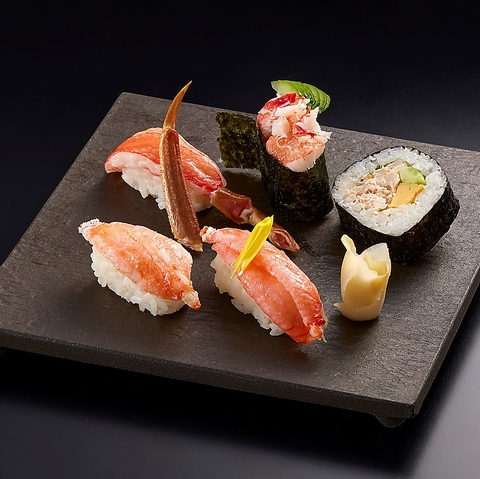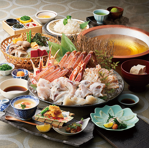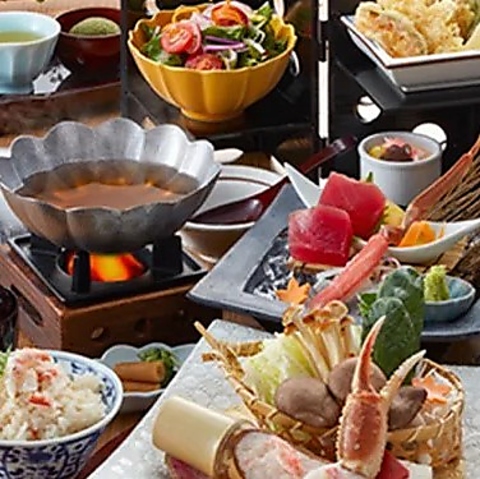 かに胡麻豆富・お造り盛り合せ・大海老天婦羅・たらばかに炭火焼・しゃぶしゃぶ肉※黒毛牛しゃぶの場合+1,100円(税込)、特選霜降り和牛しゃぶの場合+2,970円(税込)・野菜盛り・かに真薯・かに太巻き・稲庭風うどん(蓴菜と酢橘)・甘味※写真はたらばかに炭火焼と国産黒毛牛しゃぶ・霧島黒豚しゃぶ 食べ比べコースです