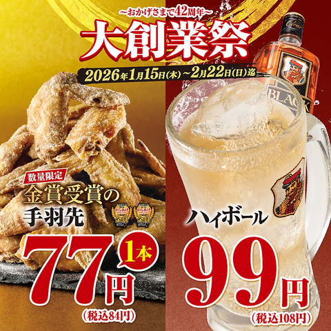 期間中ず~っとブラックニッカハイボール一杯99円(税込108円)♪金賞受賞の手羽先一本77円(税込84円)♪