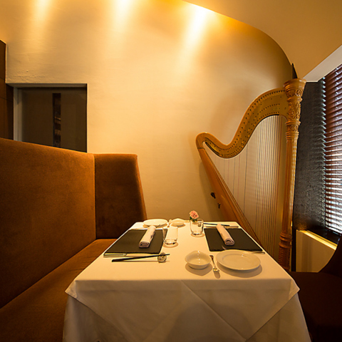 大人の隠れ家としての上質な空間です。優雅に楽しんでいただく料理と会話。店内にはハープも置かれ、落ち着いたインテリアと流れる時間の中で、心から寛げるひとときを提供します。15名様から貸切も可能です。格調高い雰囲気が漂う場所で、シェフが繰り出す独創的な品々の数々を、大切な方と存分に堪能ください。