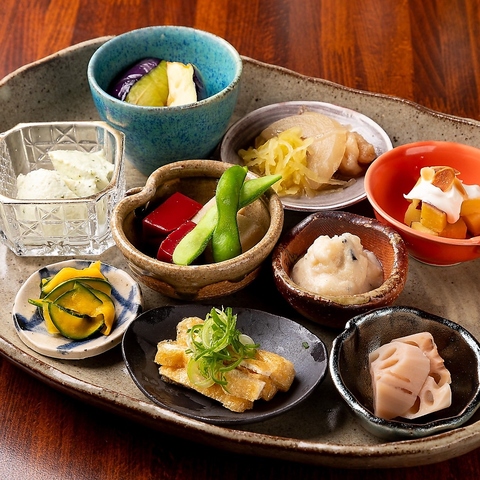 京茄子のたいたん、高野豆腐、赤こんにゃく、お芋のクリームチーズ和え、とようけ屋山本のしそ豆腐、胡麻豆腐、薄揚げ、蓮根のたいたん、青瓜の昆布和え、コリンキーポン酢、茗荷の甘酢漬け、むかごの海老粉和え