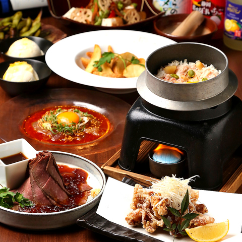 ロングセラー「総料理長自慢の特製ローストビーフ」をメインに人気メニュー「ぷりぷり海老のマヨネーズ和え」やお酒に合う「蟹味噌甲羅焼き」など肉と海鮮を堪能でき、さらに〆には「お出汁が効いた鶏と牛蒡の釜飯」をご用意!接待や宴会、デートにもおすすめです♪★期間限定で4500円が→4000円になるクーポン有り★