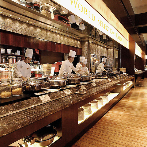 ホテルブッフェらしい洗練された店内。磨き上げられたフローリングを落ち着いたライトが穏やかに照らし、黄金色の空間に黒を基調としたインテリアが上品に映えます。奥行きのあるブッフェカウンターよりお好みの料理をお選びいただけます。