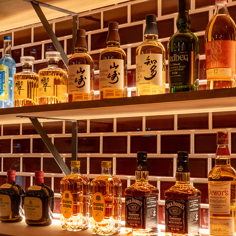バーカウンター【会場設備】奥にお酒のボトルがずらりと並ぶ雰囲気抜群のバーカウンター。飲み放題は、こちらからお好きなドリンクをスタッフにご注文いただき、お受け取りくださ