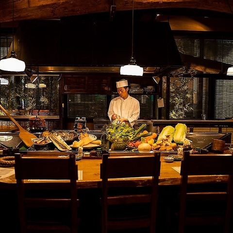 炭火の炎が上がる炉端を囲む12席の粋な円形カウンター。目の前で焼かれる豪快な炭火焼きや新鮮魚介は、目でも堪能できます。20時に炊き上がる季節の土鍋ご飯は、カウンター席ならではの特権!全国から集めた銘酒とともに、飲んで食べて語らう贅沢なひとときをお楽しみください。