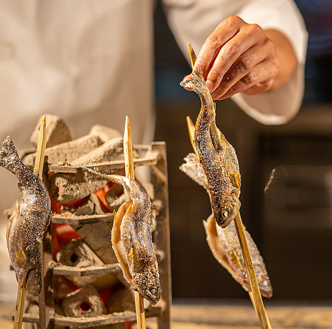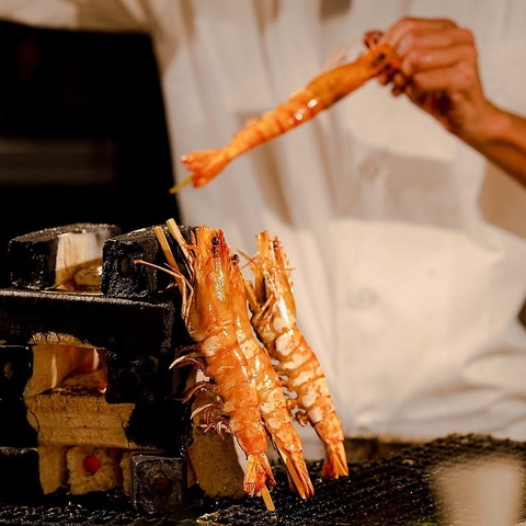 炭火焼きカウンターでは、目の前で豪快な調理まで堪能できます