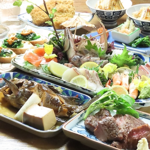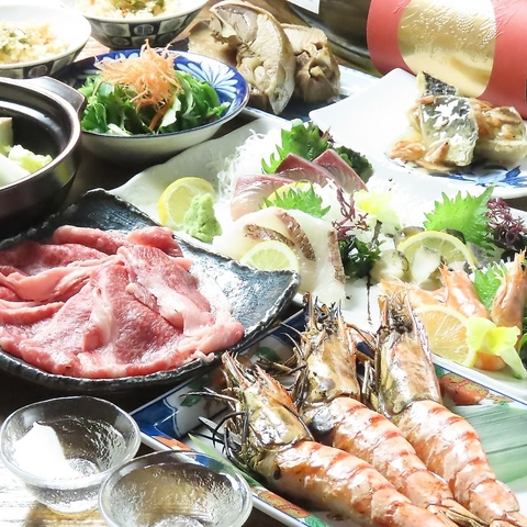 より贅沢に、当店自慢の逸品の数々を味わえる豪華なコース◎名物!大エビ原始焼きや国産牛のしゃぶしゃぶ鍋、骨付きマグロの西京焼きなど、広島の幸とこだわりの美味を全7品でご用意♪地酒12種を含む120分飲み放題付で大満足!接待や少し贅沢なご宴会にも最適です。仕入れ状況により内容が変わるため、詳細はお気軽にお問い合わせください。