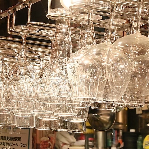 カウンターの天井に吊り下げられた様々なグラスは、クラフトビールの多種多様な味わいを引き出す重要なポイントです。ポパイではそれぞれのビールが一番美味しく飲めるグラスを、テイスティングして選択しています。