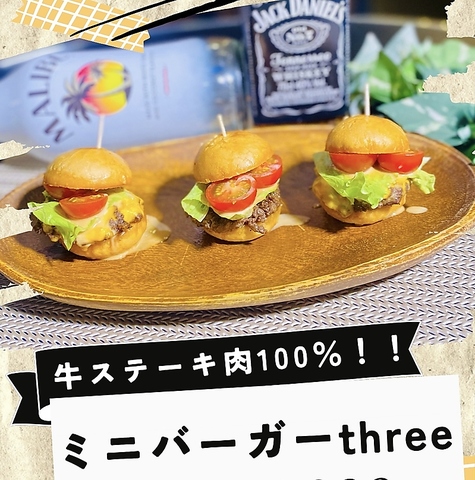 ご注文いただいてから叩いた牛ステーキ肉を100%使用!!肉肉しい食べきりサイズの可愛いミニバーガーです☆ リピーター続出中!!