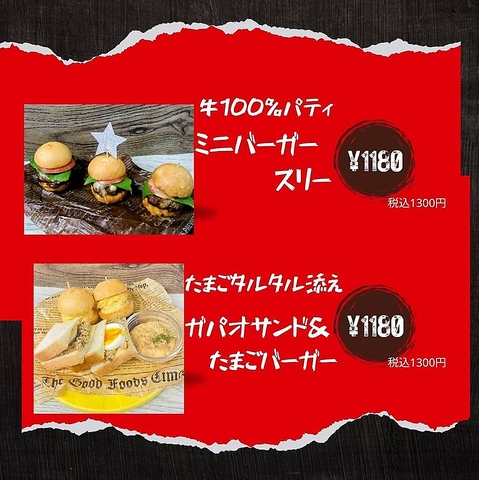 ミニサイズのバーガーを牛100%の本格バーガーor甘じょっぱい玉子バーガーの2種類ご用意いたしました!