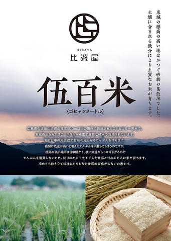 当店でご提供しているコシヒカリは、比婆屋の「伍百米」を使用しています。この比婆屋の「伍百米」は、でんぷんをたっぷりと蓄えることで、炊き上げればふっくらと輝き、噛むほどにもちもちとした食感と優しい甘さが広がる逸品です。こだわりの「伍百米」を、当店自慢のお肉とともに心ゆくまでお楽しみください。