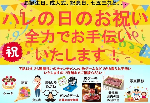 各種お祝いのご相談承っております!ケーキや花束の持ち込み、手配も可能ですので、お気軽にご連絡ください。特別な日が素敵な思い出となるよう、スタッフ一同心を込めておもてなしいたします。