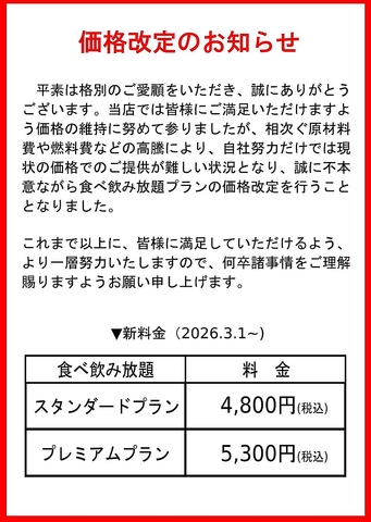 いつも当店をご愛顧いただき誠にありがとうございます。原材料費等の高騰により、2026年3月1日より食べ飲み放題プランの価格を改定いたします。◆スタンダード4,800円◆プレミアム5,300円(各税込)となります。何卒ご理解を賜りますようお願い申し上げます。