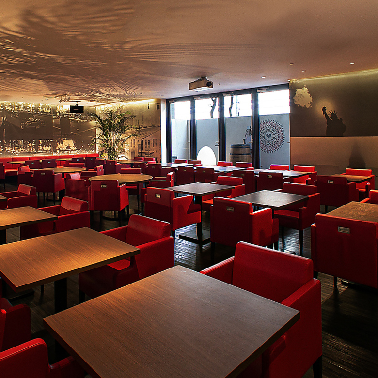 シックなモノトーンにビビットな赤いチェア、ニューヨーク風景の壁画が非日常感を醸し出します。美味しい食事と一緒に空間もお楽しみください。
