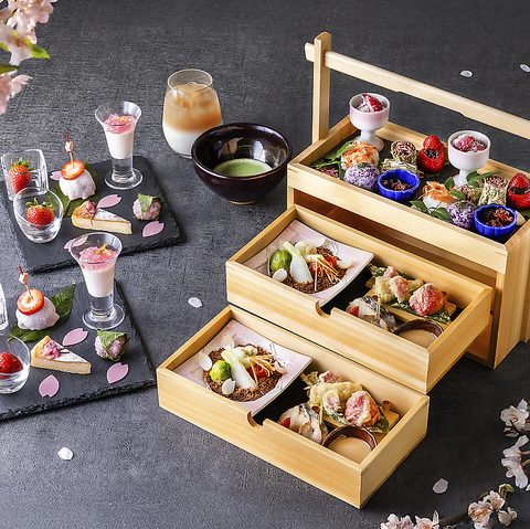 春の香りがふんわりと漂う桜といちごの和風アフタヌーンティー。「桜のパンナコッタ」や「いちご大福」など、優しい桜の風味と甘酸っぱいいちごのハーモニーをお楽しみください。