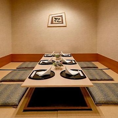 掘りごたつ式和室「初雁」「三芳野」をご用意しております。それぞれ6名様までご利用いただけるお席です。掘りごたつなので、足を伸ばしてゆっくりお寛ぎいただけます。会食や接待におすすめです。また、個室料は3000円(税込)頂戴いたします。※写真は「三芳野」です。