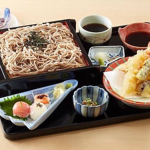 おそばは温かい、冷たいがお選びいただけます。天ぷらや手毬寿司がついたお昼限定の御膳です。