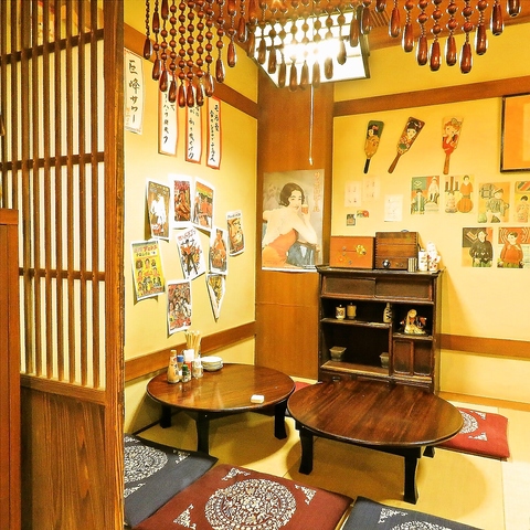 壁にぶら下がる短冊メニュー、畳とちゃぶ台に、レトロな雰囲気のポスター、懐メロが流れ、まるで古き良き 60年代~70年代の下町にあった大衆酒場にタイムスリップしたような空間が広がります。 駄菓子屋コーナーもございます。