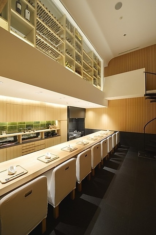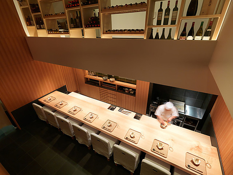 天然の檜の一枚板のカウンターは、贅沢な雰囲気で全8席を完備。目の前で調理の様子を眺めながらの食事が可能です。