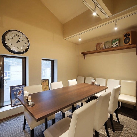 【2階貸切フロア:37~48名様まで】清潔感と温かみに包まれた、居心地のよい空間。カジュアルな接待やビジネスシーンに最適なフロア貸切スペースをご用意。四角い間取りで全体が見渡せるので、和やかな雰囲気の中で会話も弾みます。スポーツ観戦や二次会、ちょっとしたパーティーにもぴったりの空間です。