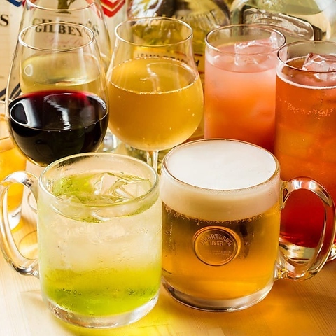| カクテル | カシス/ライチ/カンパリ/チンザノ/ピーチ/マリブ/ウォッカ/ジン×ソーダ/ジンジャーエール/オレンジジュース/グレープフルーツソーダ/トニックウォーター/コーラ/ウーロン茶 |