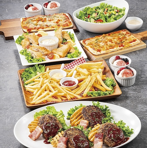 手軽につまめる軽食や、麺・ごはんものなどのしっかりとしたお食事、ついつい手が伸びるデザートまで、フードメニューも充実!パーティーシーンに最適なプレートも多数! 詳しくは料理・ドリンク・コースページへ◎