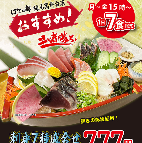 月~金15時から限定7食刺身7種777円!無くなり次第終了、1グループにつき1つの注文となります。
