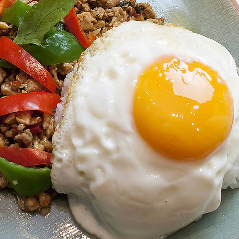 「ガイ・ガパオ」ガパオとは、ホーリーバジルのこと。目玉焼きとよく混ぜながらお召し上がりください。